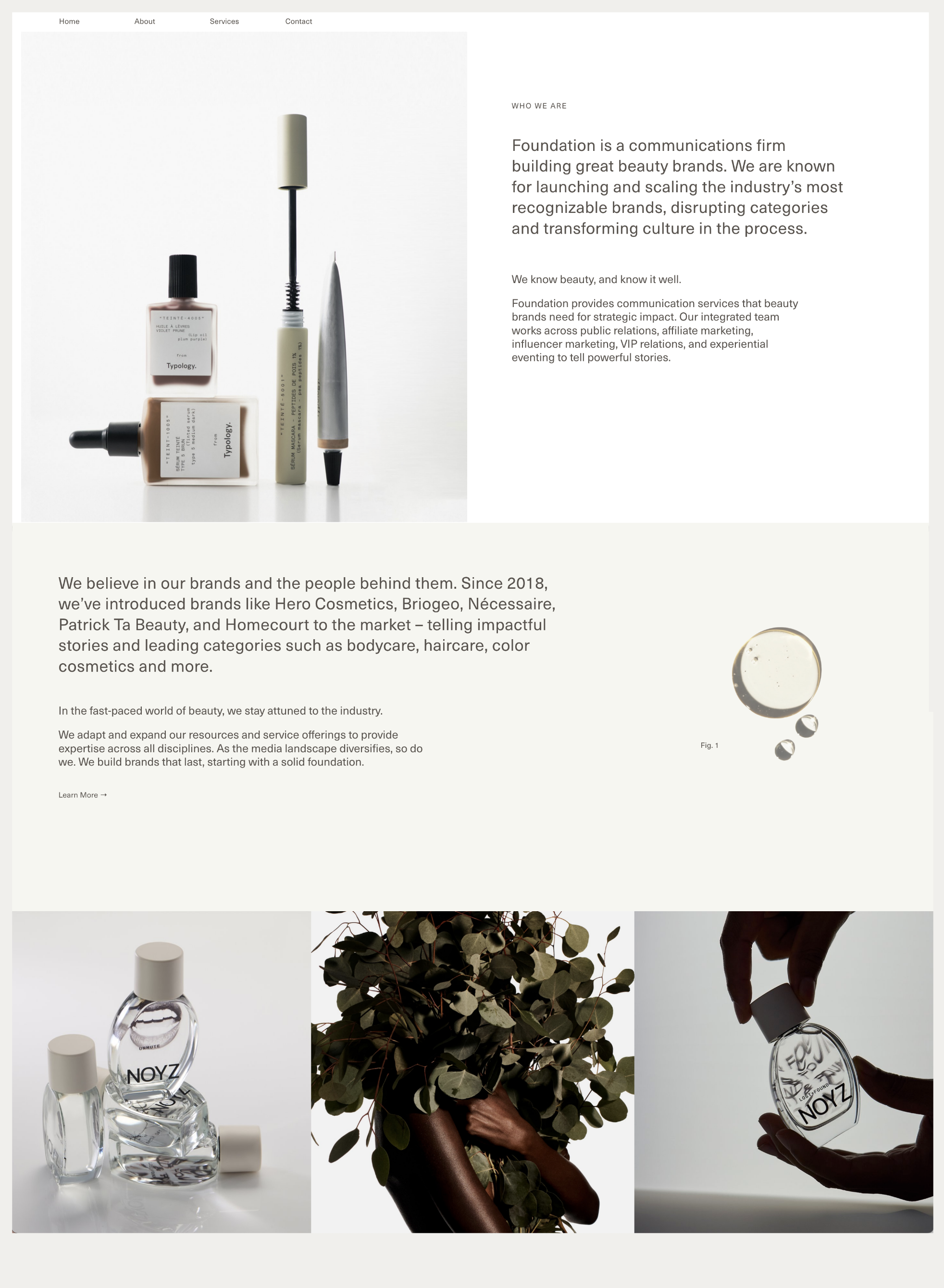 Foundation co-founders, Jenny and Kelly, approached the Somewhere Still studio to discuss a comprehensive rebrand for their bi-coastal communications agency. We re-defined their leading logotype to produce a modern and unified typeface alongside a minimal and enclosed brand mark that anchored the brand ethos of intuitive and strategic thinking. The logotype favours precision, strength, and has a clean functional finish, enhanced by a mineral-inspired colour palette. The distinctive identity was applied to a new portfolio website, designed to re-centre the brand and showcase its services and array of impressive clients. The site is consistent in form, visually uniting the refreshed identity in a digital landscape of varying type sizes, grid structures, and subtle movement. A simple information system across the web pages distils their offerings into a layered but clear expression of their mission as a business.
