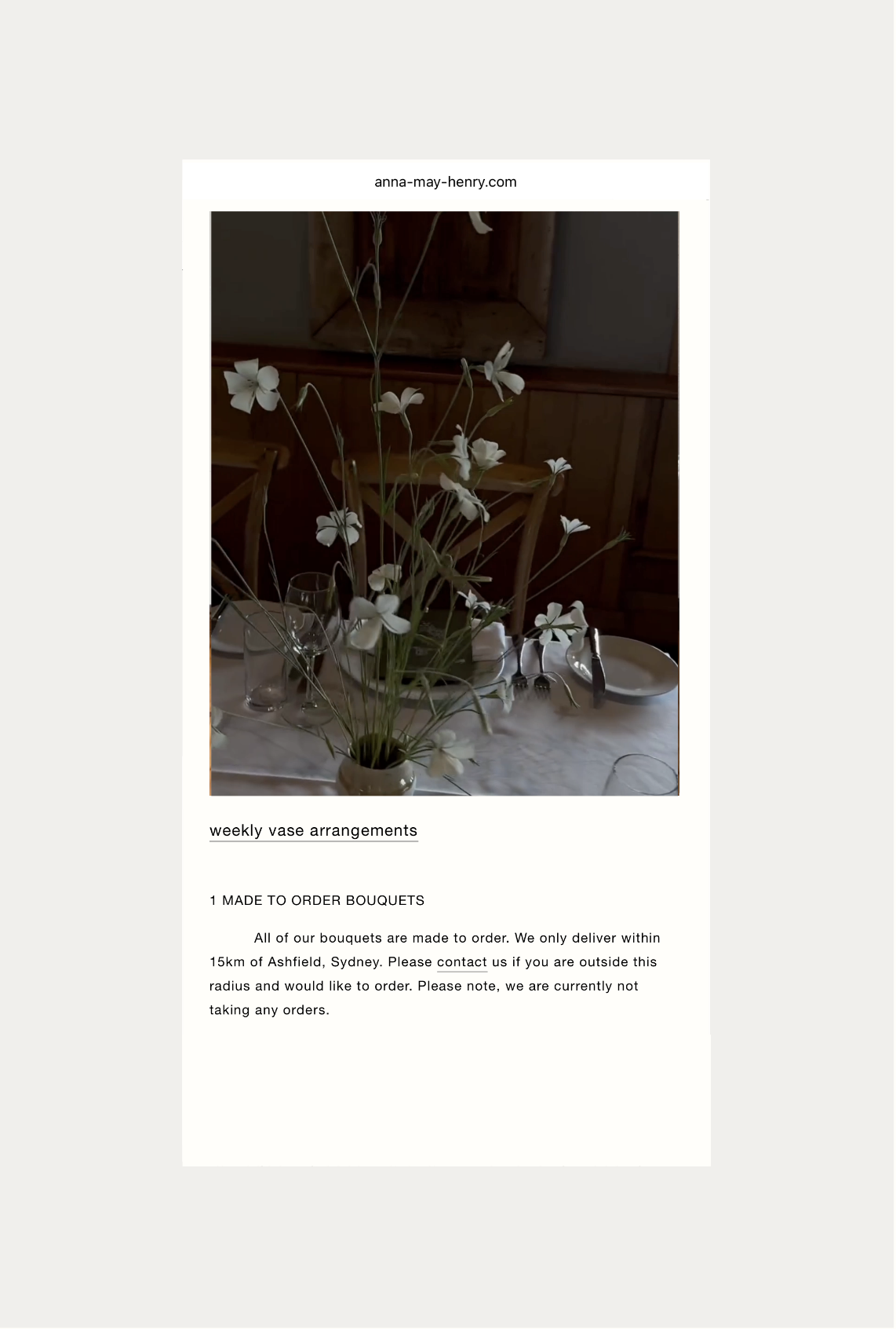 Partnering with Florist Anna May Henry on a comprehensive rebrand was a pleasure; we focused on a subtle refinement of across-the-board typography alongside a contemporary logotype that playfully draws its form from nature. Our strategic process was driven by an inherent curiosity for Anna’s incredible intuition as a florist. Small, considered type treatments form the guiding concept of the visual language, designed to feel soft and, on occasion, spontaneous. Our long-term partnership has, over time, developed and evolved as Anna’s brand has done, and we’ve continued to support Anna and her values through considered design practices. We’ve translated Anna’s clear and sustainable ethos into a simple and versatile ecosystem of type, soft colour, and elegant layout treatments.