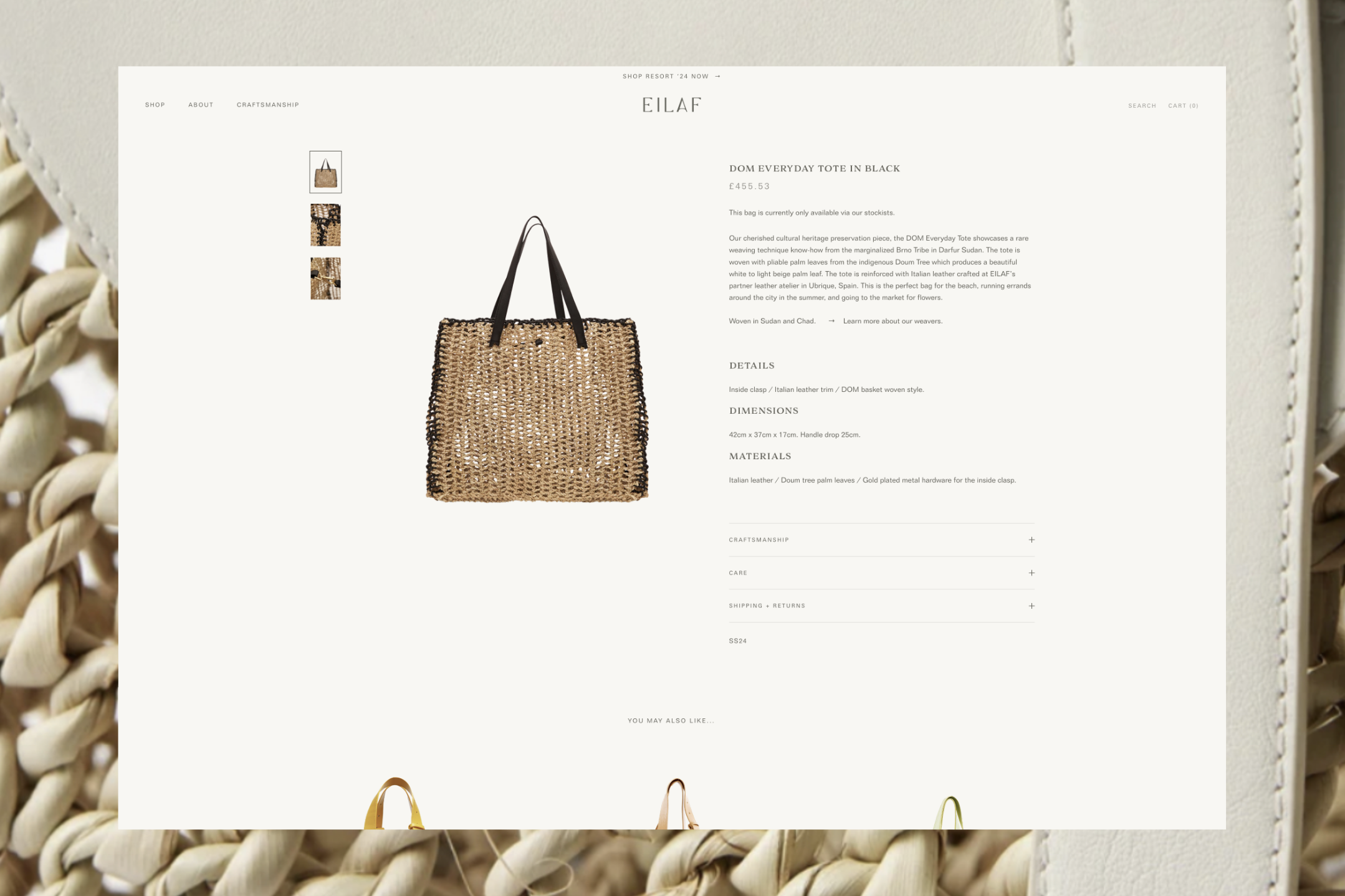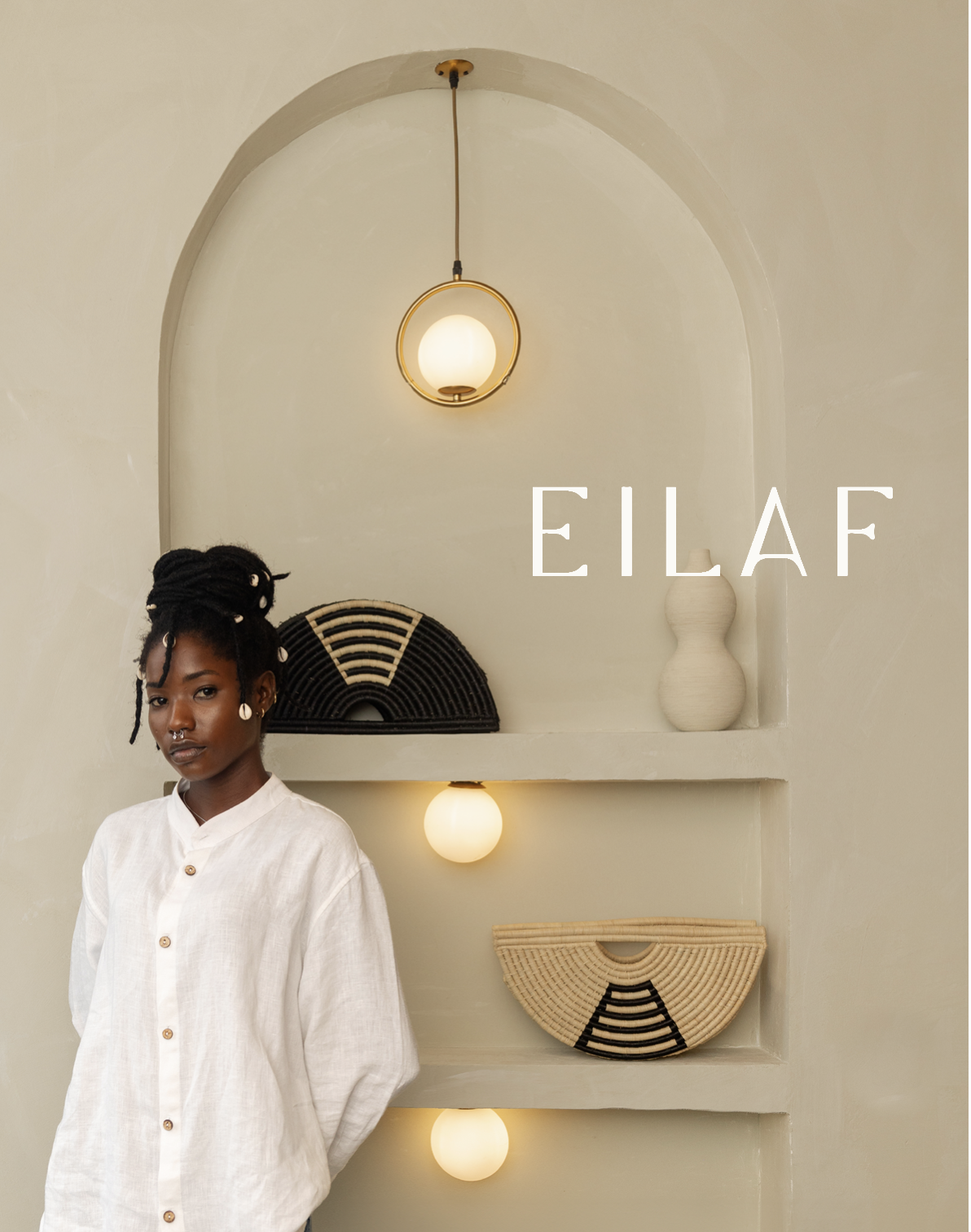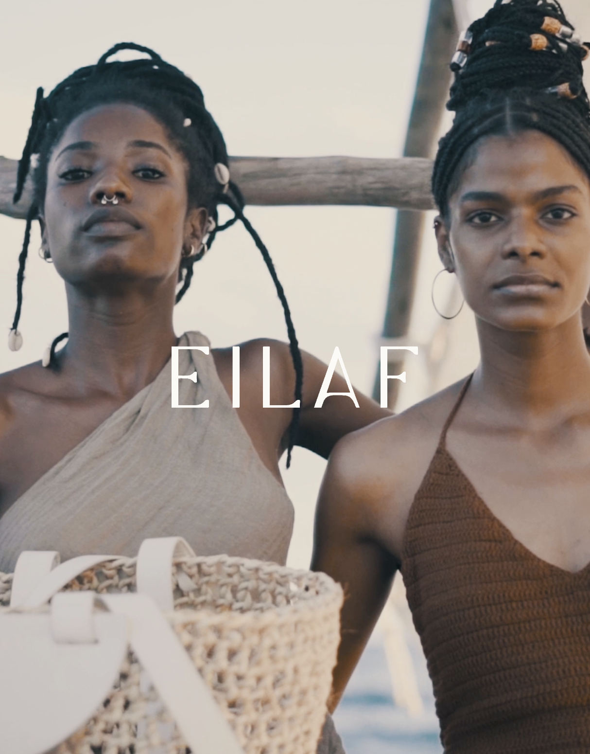 Our long-term partnership with EILAF has spanned many years, and our work has always been focused on versatility and flexibility, ensuring the brand identity is given the space to evolve and adapt through the seasons. The brand system plays on innovation, exploring traditional craftsmanship but through a modern lens. We established a rich palette of earthy colours alongside a hand-drawn custom logotype based on hand-painted way-finding found in Zanzibar. We developed a purposeful e-commerce platform for EILAF, to invite a heightened online experience for users, utilising ongoing storytelling that effortlessly highlights EILAF’s mission as a brand. Components of the site include videography by Nassor Othman, asymmetrical page layouts and simplistic product imagery. These elements came together to produce an impactful and exclusive digital space that allows the brand to faithfully illustrate how they have managed to nurture and support their weavers. Our print and digital design work for EILAF includes Look books for potential wholesale partners. The spreads are designed to engage with the cohesivity of the brand and website, underscoring the brand ethos and further extending visual storytelling. These design pieces for EILAF are useful in contributing to their marketing and brand strategy as well as strengthening their industry connections.