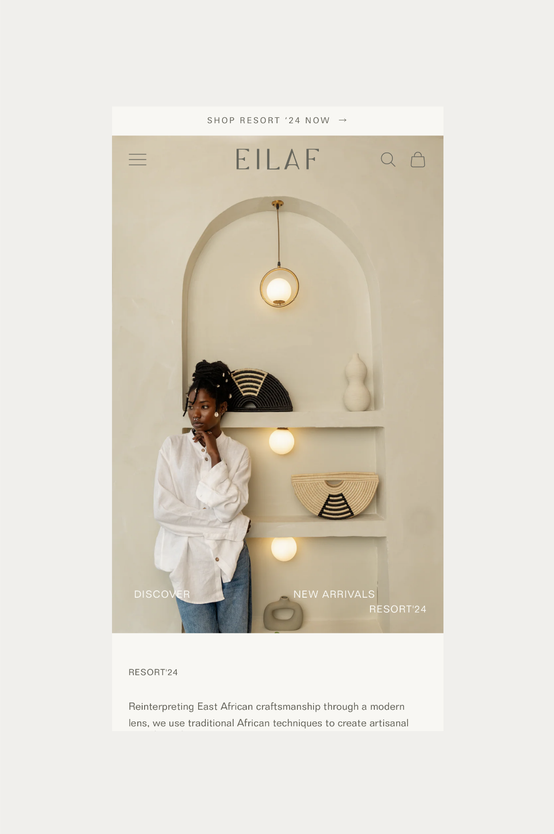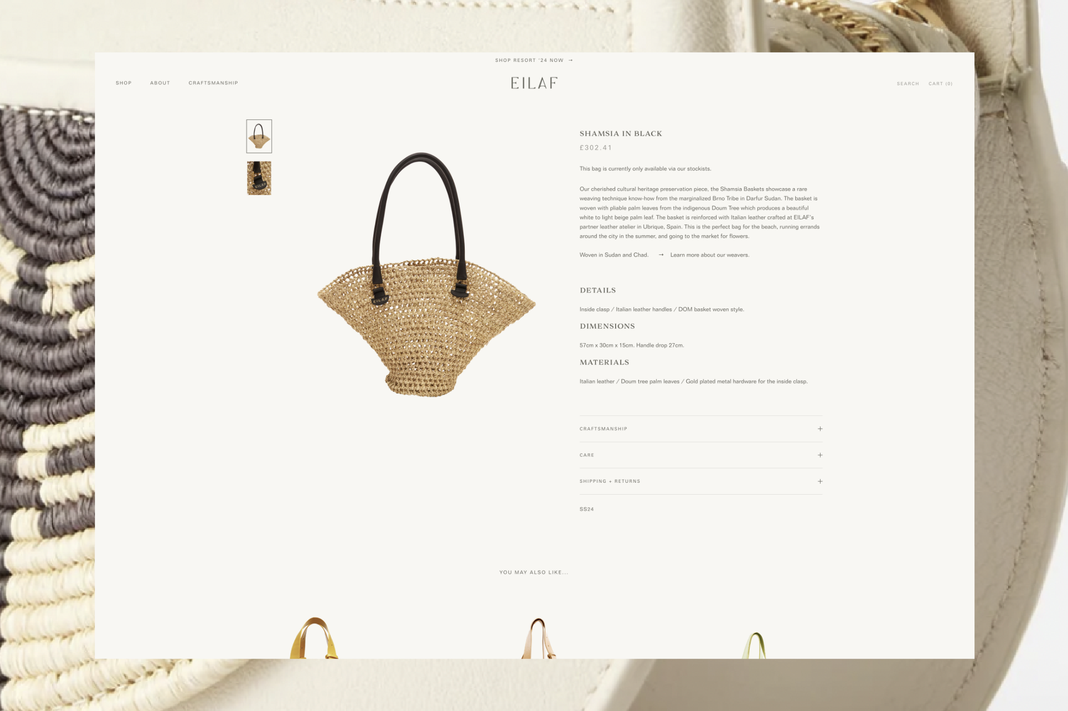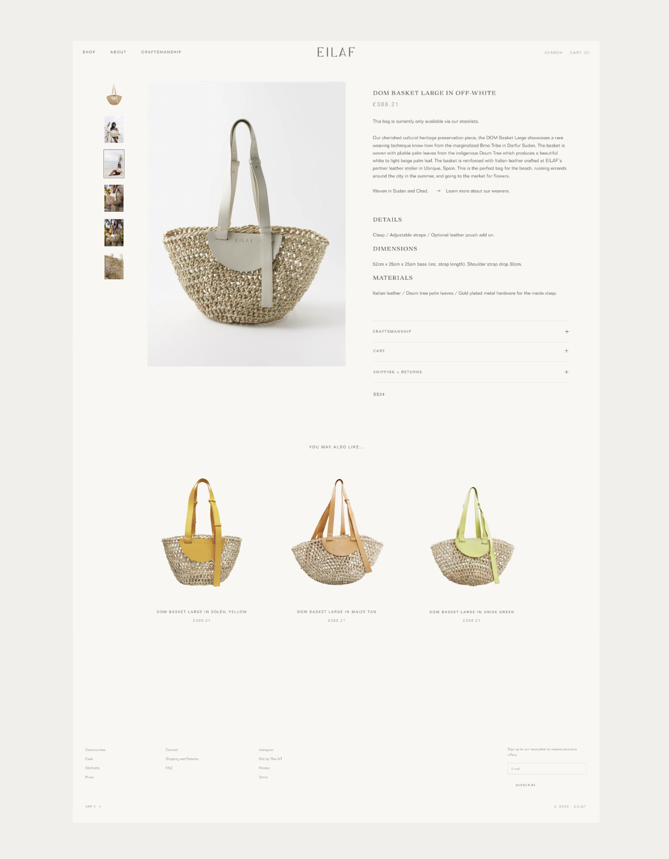 Our long-term partnership with EILAF has spanned many years, and our work has always been focused on versatility and flexibility, ensuring the brand identity is given the space to evolve and adapt through the seasons. The brand system plays on innovation, exploring traditional craftsmanship but through a modern lens. We established a rich palette of earthy colours alongside a hand-drawn custom logotype based on hand-painted way-finding found in Zanzibar. We developed a purposeful e-commerce platform for EILAF, to invite a heightened online experience for users, utilising ongoing storytelling that effortlessly highlights EILAF’s mission as a brand. Components of the site include videography by Nassor Othman, asymmetrical page layouts and simplistic product imagery. These elements came together to produce an impactful and exclusive digital space that allows the brand to faithfully illustrate how they have managed to nurture and support their weavers. Our print and digital design work for EILAF includes Look books for potential wholesale partners. The spreads are designed to engage with the cohesivity of the brand and website, underscoring the brand ethos and further extending visual storytelling. These design pieces for EILAF are useful in contributing to their marketing and brand strategy as well as strengthening their industry connections.