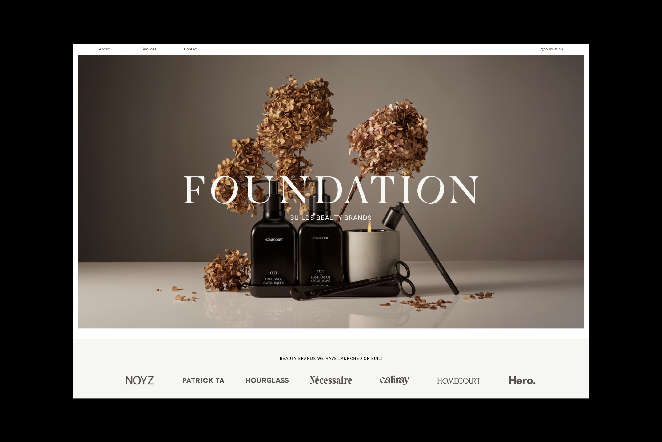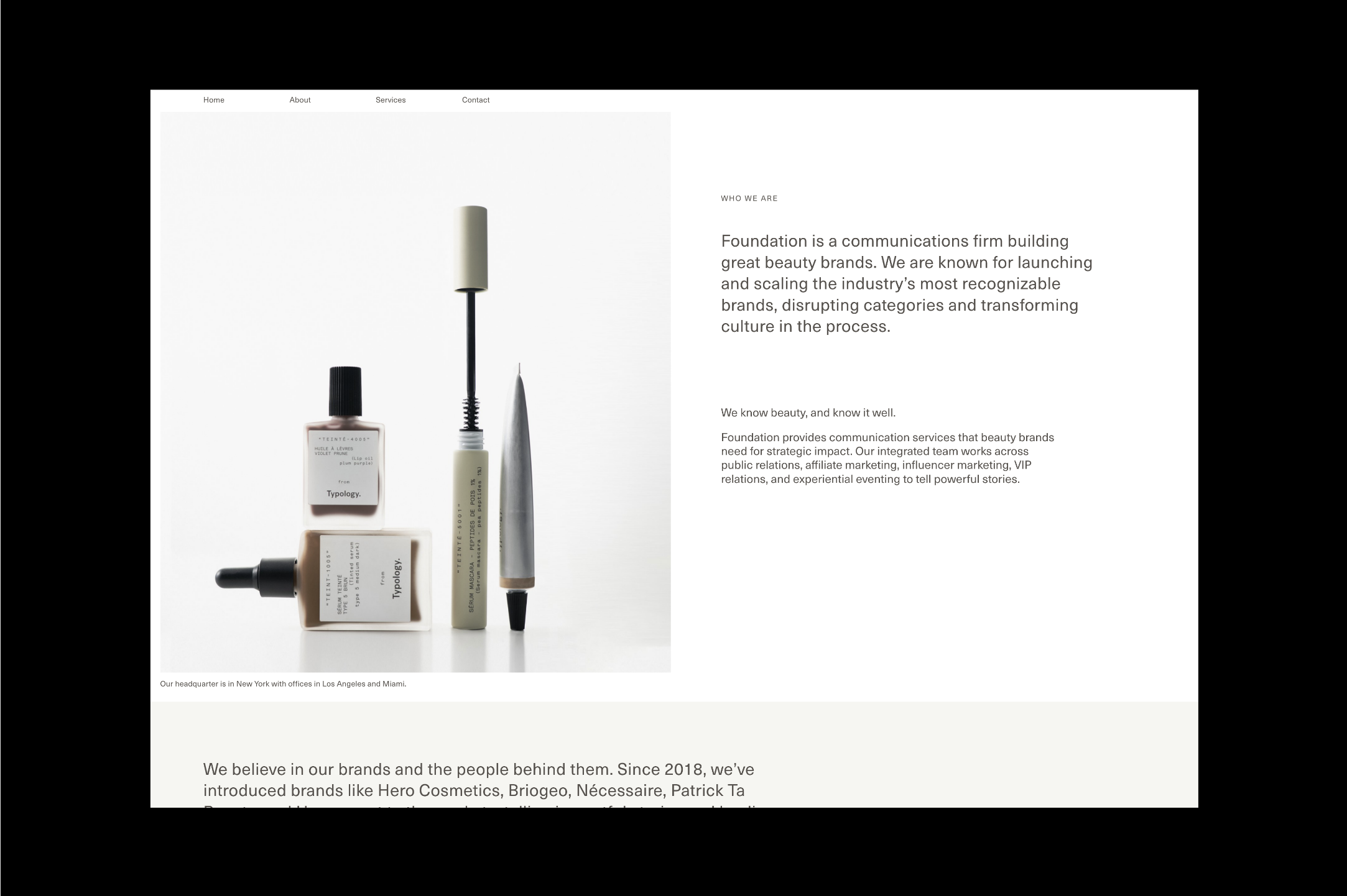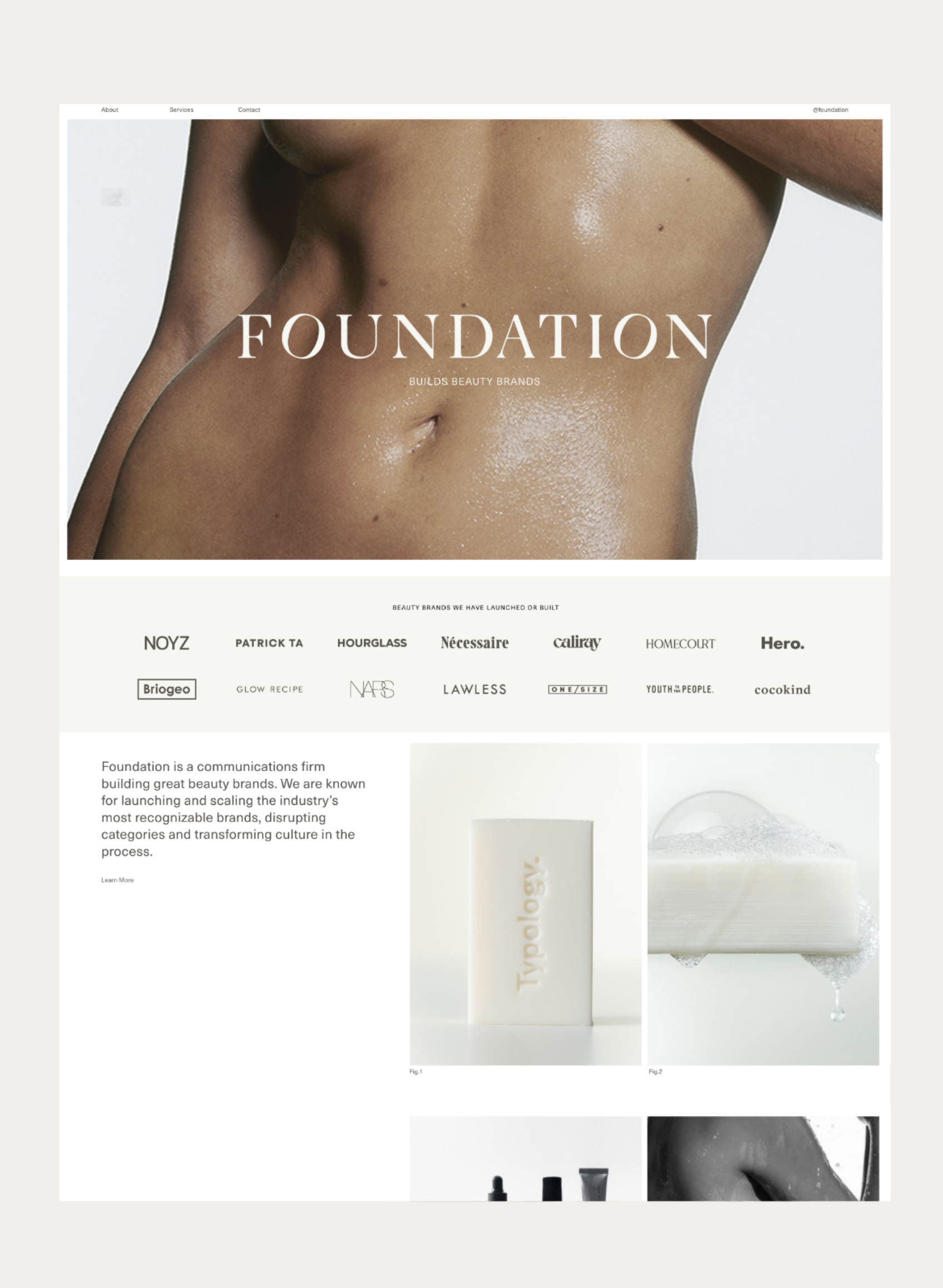 Foundation co-founders, Jenny and Kelly, approached the Somewhere Still studio to discuss a comprehensive rebrand for their bi-coastal communications agency. We re-defined their leading logotype to produce a modern and unified typeface alongside a minimal and enclosed brand mark that anchored the brand ethos of intuitive and strategic thinking. The logotype favours precision, strength, and has a clean functional finish, enhanced by a mineral-inspired colour palette. The distinctive identity was applied to a new portfolio website, designed to re-centre the brand and showcase its services and array of impressive clients. The site is consistent in form, visually uniting the refreshed identity in a digital landscape of varying type sizes, grid structures, and subtle movement. A simple information system across the web pages distils their offerings into a layered but clear expression of their mission as a business.
