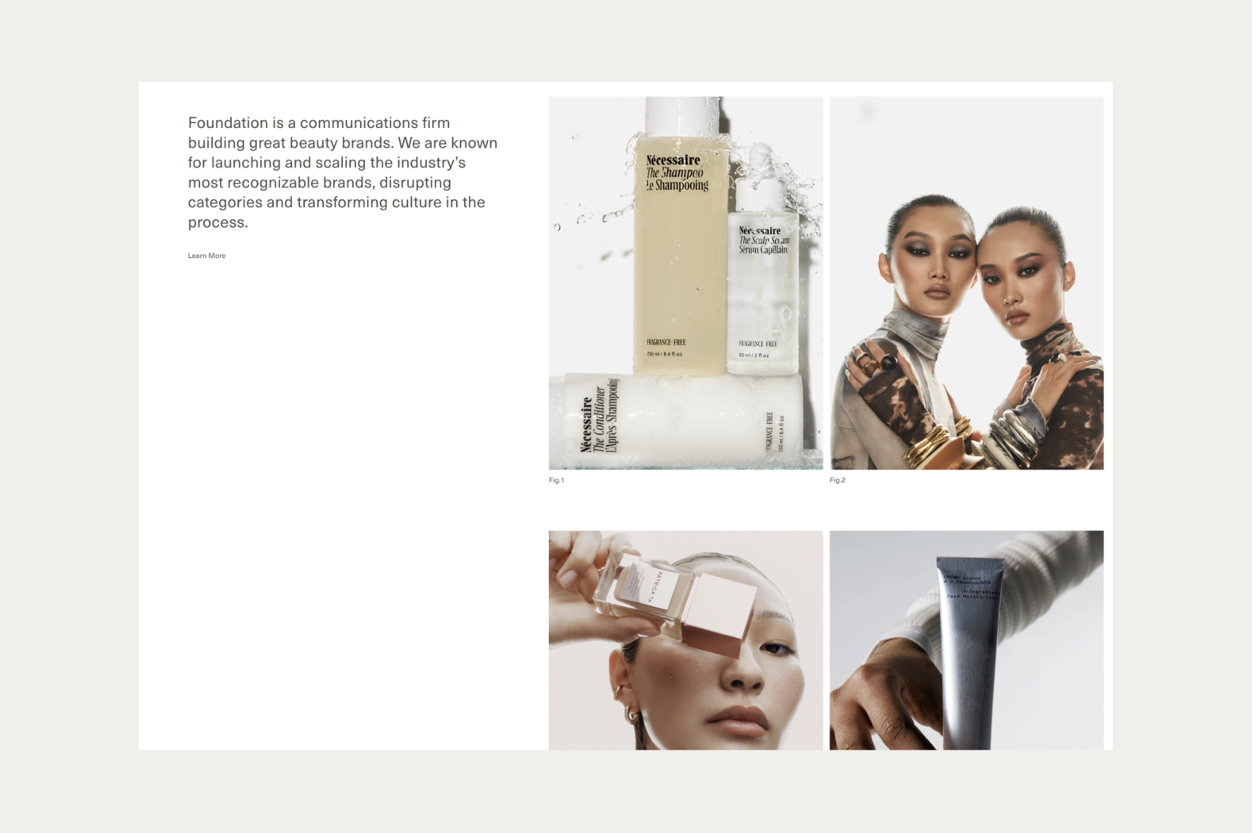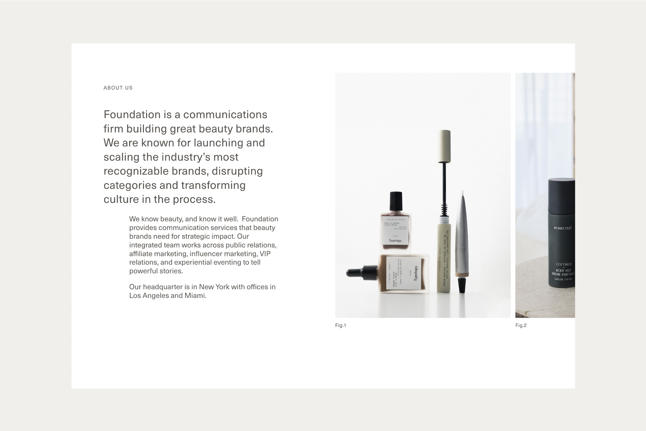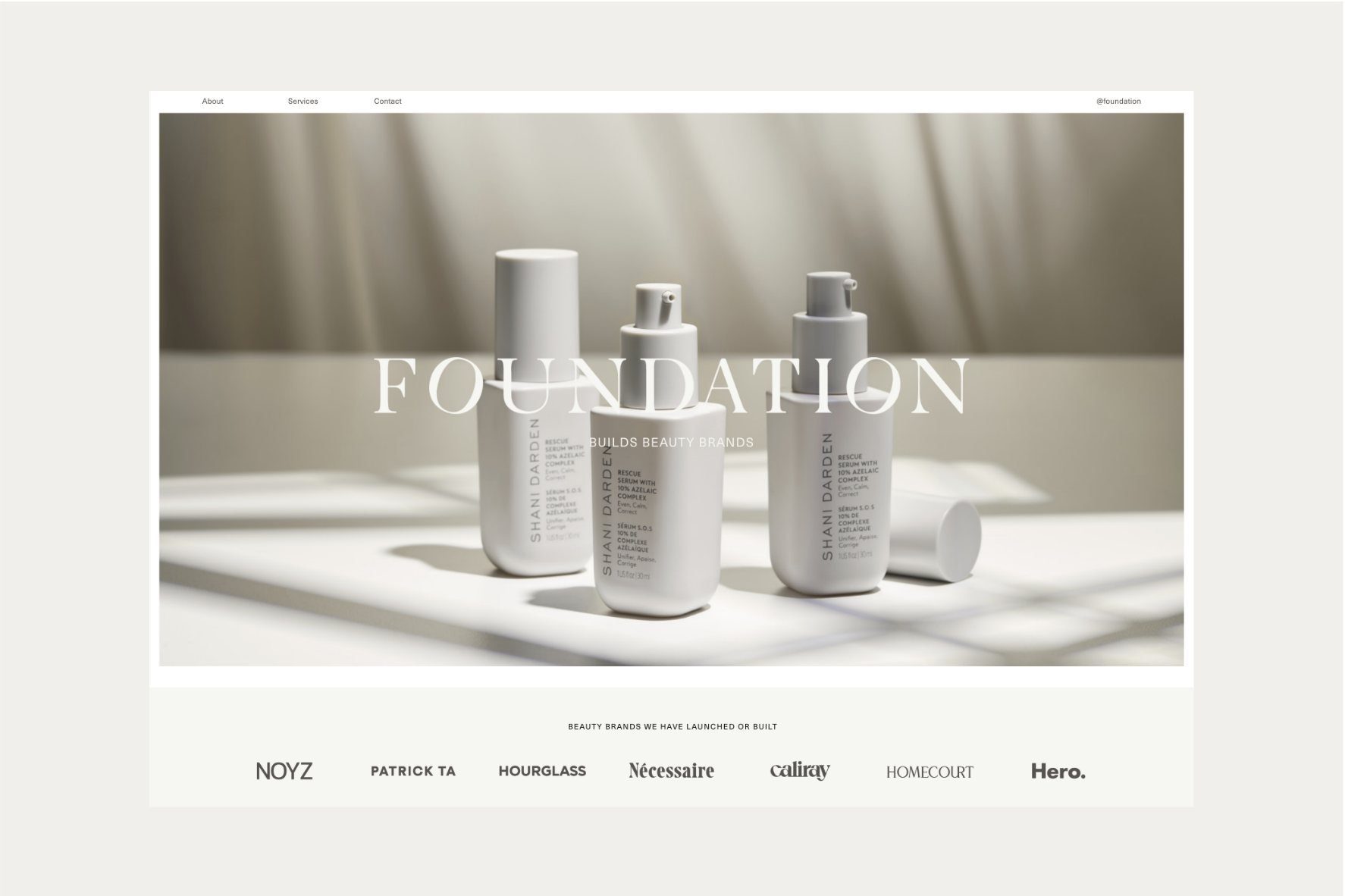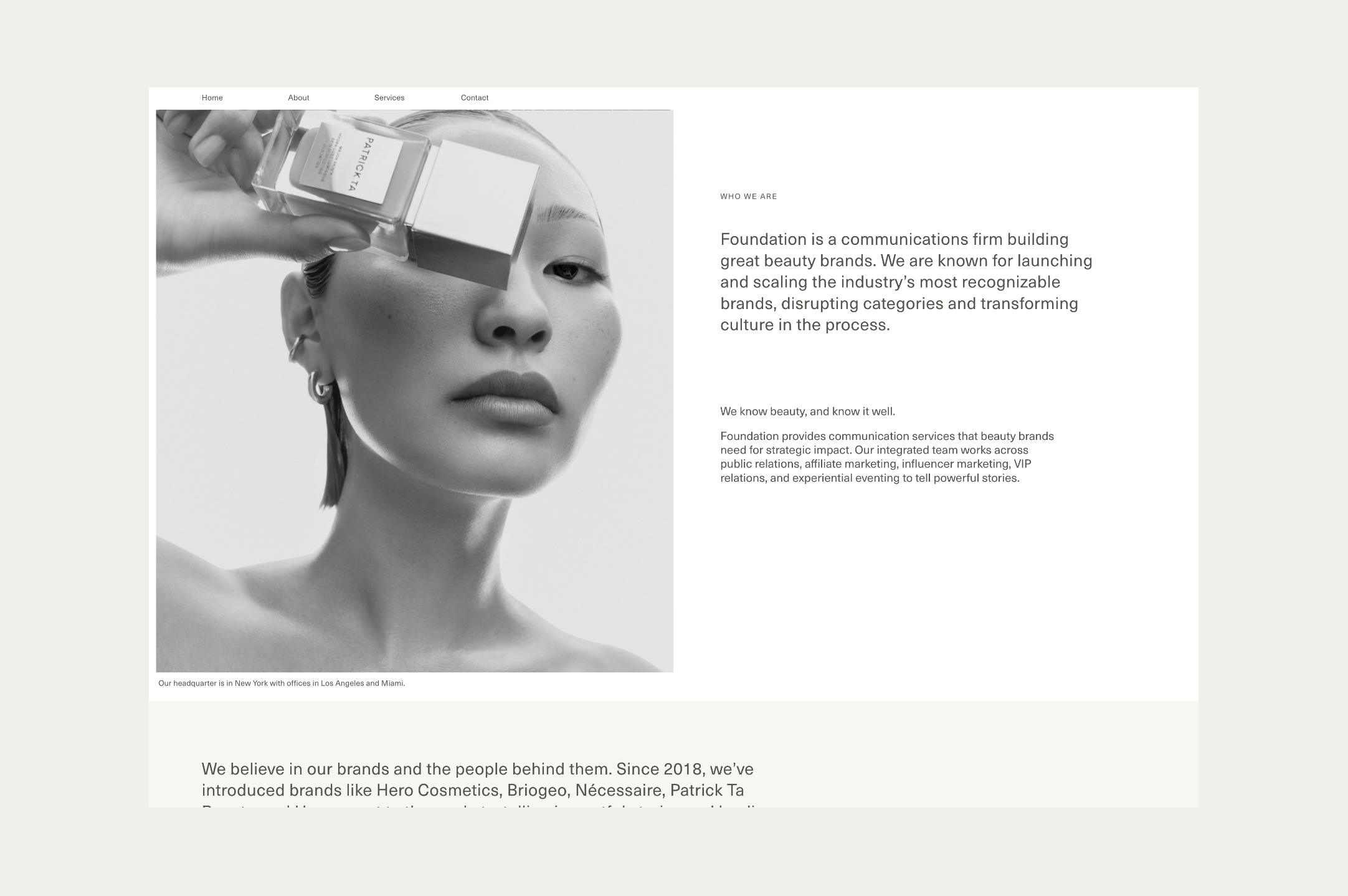 Foundation co-founders, Jenny and Kelly, approached the Somewhere Still studio to discuss a comprehensive rebrand for their bi-coastal communications agency. We re-defined their leading logotype to produce a modern and unified typeface alongside a minimal and enclosed brand mark that anchored the brand ethos of intuitive and strategic thinking. The logotype favours precision, strength, and has a clean functional finish, enhanced by a mineral-inspired colour palette. The distinctive identity was applied to a new portfolio website, designed to re-centre the brand and showcase its services and array of impressive clients. The site is consistent in form, visually uniting the refreshed identity in a digital landscape of varying type sizes, grid structures, and subtle movement. A simple information system across the web pages distils their offerings into a layered but clear expression of their mission as a business.