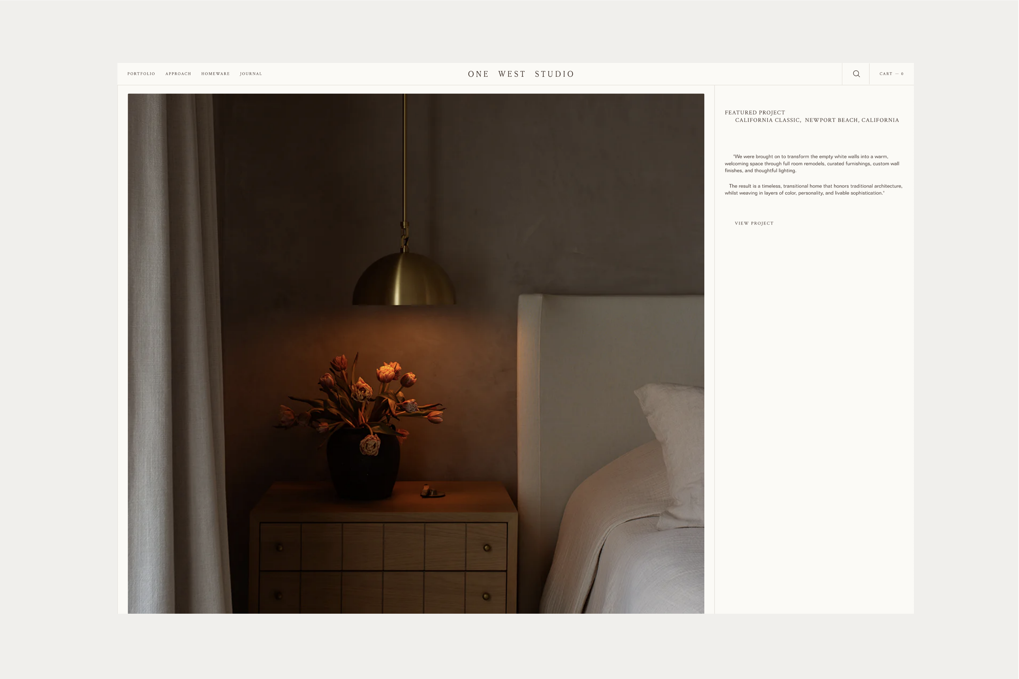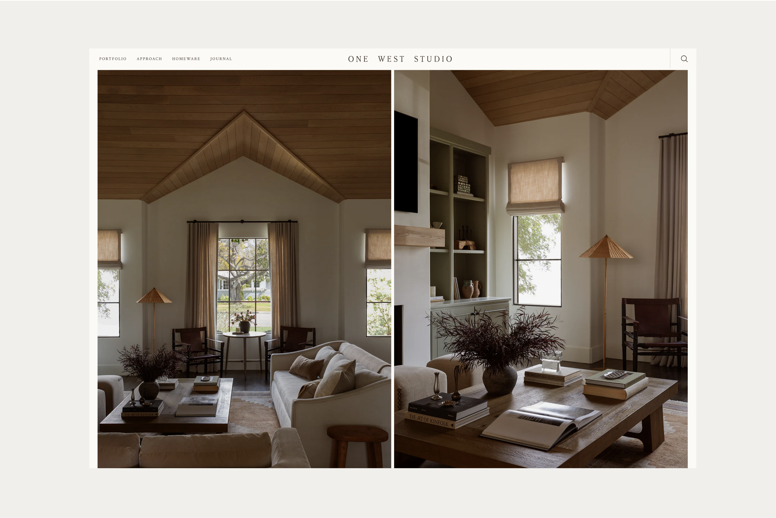 Interior Design Practice, One West Studio, invited us to develop a new brand language and accompanying portfolio site to present their ever-evolving work. A new immersive portal for One West Studio was established, complete with a fully built-out portfolio and journal space, reflecting and translating Founder Haley’s SoCal style with her transparent approach to interior design. A grid structure was implemented across the digital space, aligning subtly with the identity, designed to separate out information in a clear and architectural sense. The project brief demanded both a strategic repositioning of the brand and a complete visual departure from generic interior branding. The new colour palette sits in soft neutral tones, and the paired typographic system has been developed to communicate clarity balanced with expertise.